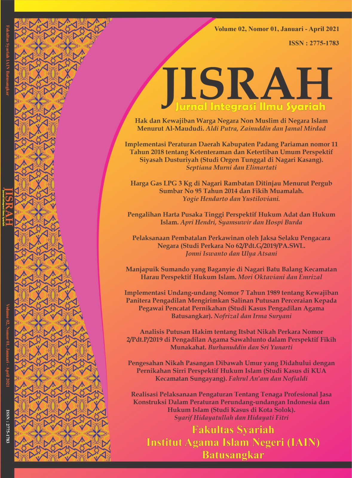 Jurnal Integrasi Ilmu Syariah (Jisrah) with ISSN 2775-3557 (Online) and 2775-1783 (Print) is aimed at spreading the research results conducted by academicians, researchers, and practitioners in the field of sharia. JISRAH encompasses research papers from researcher, academics, and practitioners. In particular, papers which consider the following general topics are invited: Islamic Law, Islamic Family Law, Constitutional Law (Siyasah), Islamic Economic Law (Muamalah) and Other Legal Studies. The journal is published periodically three times a year, i.e., every April (first edition), August (second edition), and December (third edition).